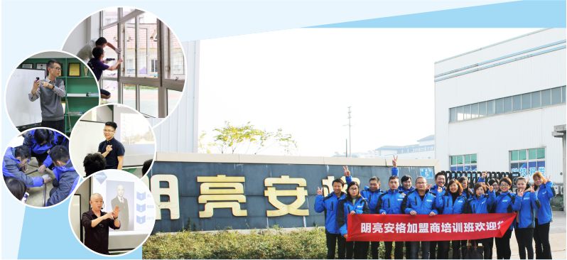 明亮安格開(kāi)設(shè)培訓(xùn)班,以成熟的培訓(xùn)機(jī)制,特聘專業(yè)講師和優(yōu)秀加盟商為加盟商開(kāi)展企業(yè)文化、產(chǎn)品知識(shí)、測(cè)量安裝、銷售技巧、活動(dòng)策劃、市場(chǎng)推廣、渠道拓展、公關(guān)禮儀等專題培訓(xùn)。